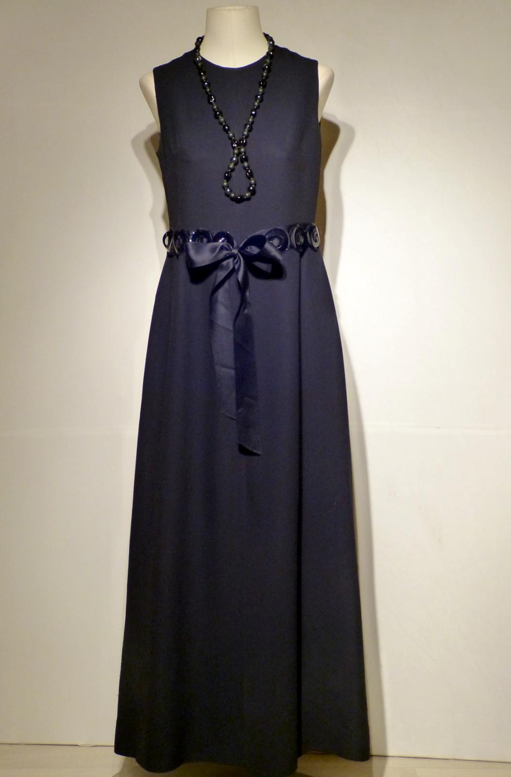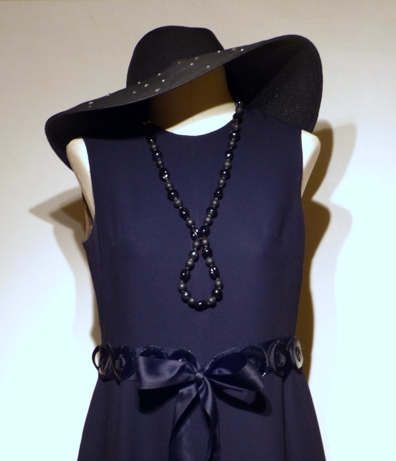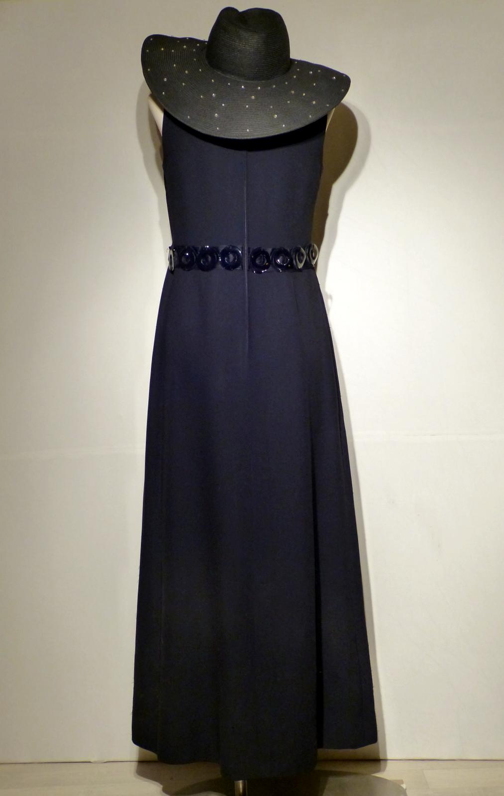 Location de robe vintage ROMI, une sublime ligne pour cette robe de couturier Roland Rulid. Une robe longue noire profond encolure ras du cou longue fente sur le devant, taille marquée par un ruban de satin et une ceinture ( ronds de skaï et perles). Romi est ici magnifiée par une capeline pour une silhouette de star.